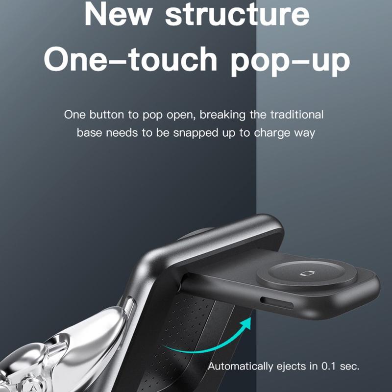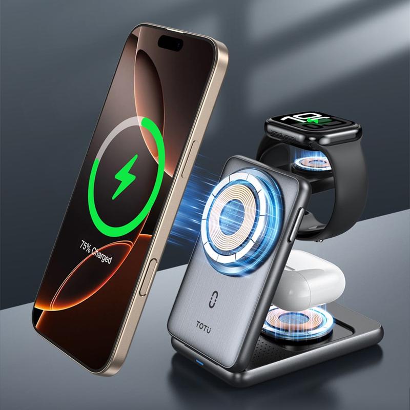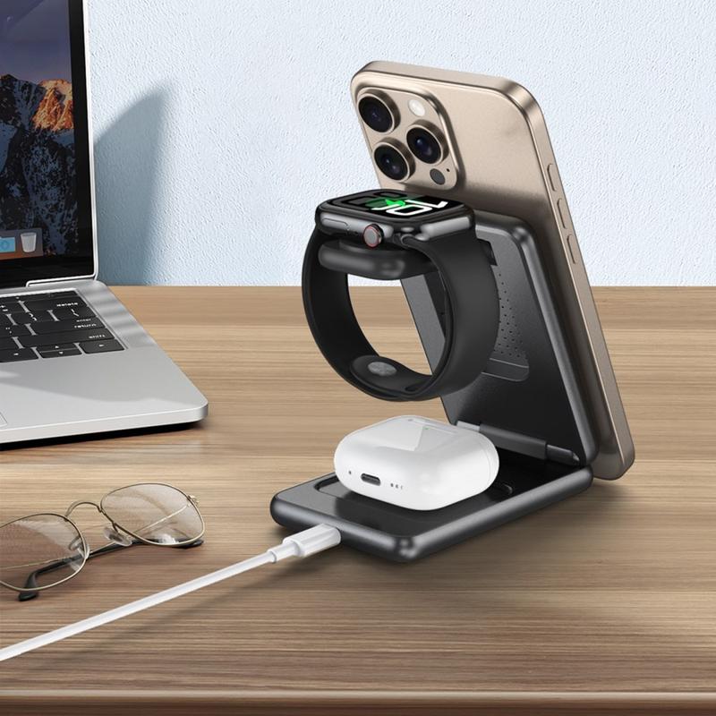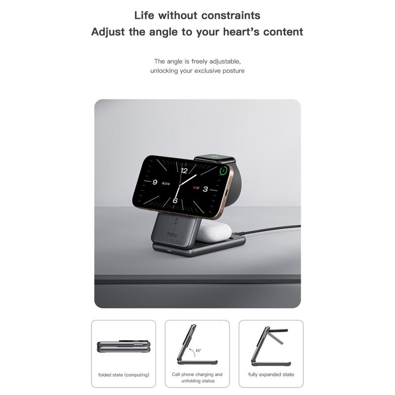 Totu CW-4-W 3-i-1 trådløs opladningsstation - magnetisk sammenklappeligt opladningsstativ til telefon, ur og ørepropper - 15W hurtig opladning