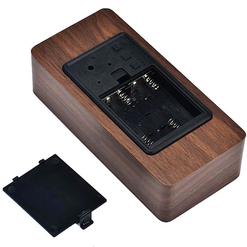 træ design LED vækkeur. Det viser klokken i 12- og 24-timers format og temperaturen i Celsius eller Fahrenheit. Den dobbelte strømforsyning betyder at du kan oplade din enhed via det medfølgende USB-kabel eller 4xAAA batterier.