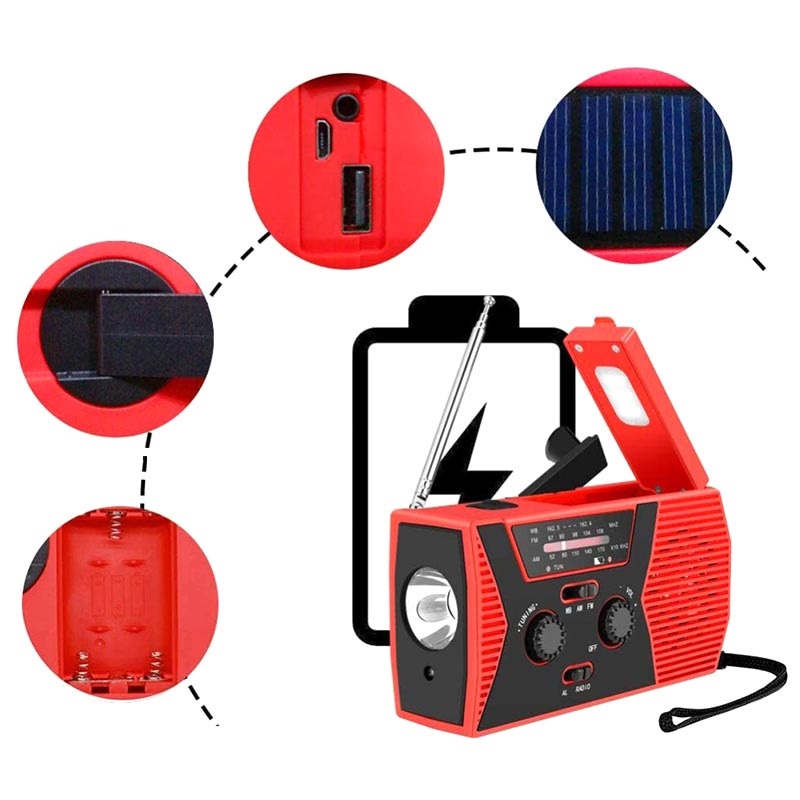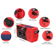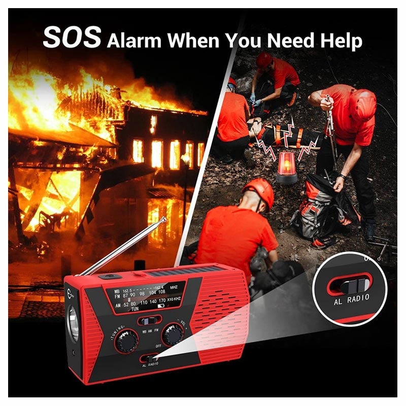 Hold dig opdateret og følg information via AM/FM-radiostationer og vejrudsigter fra NOAA-udsendelser, uanset strømforsyning fra elnettet. Den bærbare nødradio har flere strømkilder, herunder et mini solpanel, et 2000mAh batteri, en håndsvinggenerator og en plads til 3x AAA-batterier (ikke inkluderet). Den er uundværlig i nødsituationer og udstyret med LED-lys, lydstik og SOS-alarm.