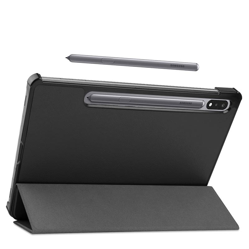 Tri-fold tabletcoveret til Samsung Galaxy Tab S7, Galaxy Tab S8 er meget tyndt og letvægtigt. Det giver en fremragende visningsoplevelse, samt en god vinkel til skrivning. Den kommer med en udskæring til din stylus pen, så den kan holdes fast magnetisk.