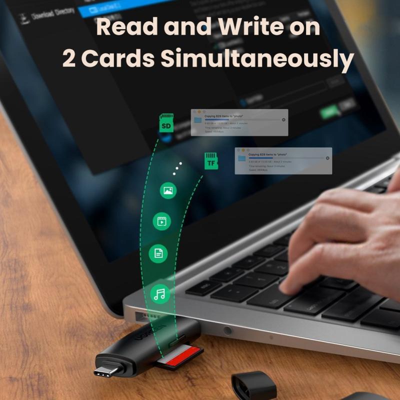 Overfør fotos og videoer hurtigere, uanset hvor du er, med UGREEN 2-i-1 SD- og microSD-kortlæser. Den er udstyret med både USB-A- og USB-C-stik og fungerer med en lang række bærbare computere, pc'er og OTG-kompatible telefoner og tablets, hvilket gør den ideel til rejser, indholdsoprettelse og hurtige sikkerhedskopier. Med dobbelte kortspor kan du læse og skrive SD- og microSD-kort på samme tid, så du kan kopiere filer, få vist indhold eller flytte data mellem kort uden at skifte adapter.