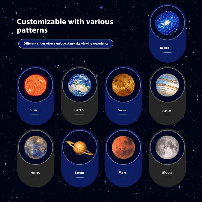 Forvandl ethvert rum til en magisk galakse med Planet Projection Lamp, en 360° roterende LED-natlampe, der er designet til at inspirere til fantasi og afslapning. Udstyret med 10 udskiftelige planetslides projicerer den levende high-definition billeder af himmelske vidundere hen over vægge og lofter og skaber en beroligende kosmisk atmosfære. Det USB-drevne plug-and-play-design sikrer bekvemmelighed og energieffektivitet, mens vidvinkellinsen giver et stærkt, men blødt lys, der er skånsomt for øjnene. Denne lampe er perfekt til børneværelser, soveværelser og boligindretning og tilføjer et fortryllende himmelsk præg til sengetid eller afslapning.