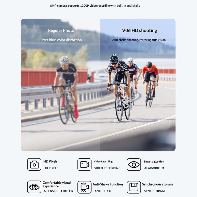 V06 AI Smart-briller til cykling/flyvning – 8 MP HD-kamera, 1200P videooptagelse, Bluetooth 5.3, IP54, UV-beskyttelse, stemmeassistent
