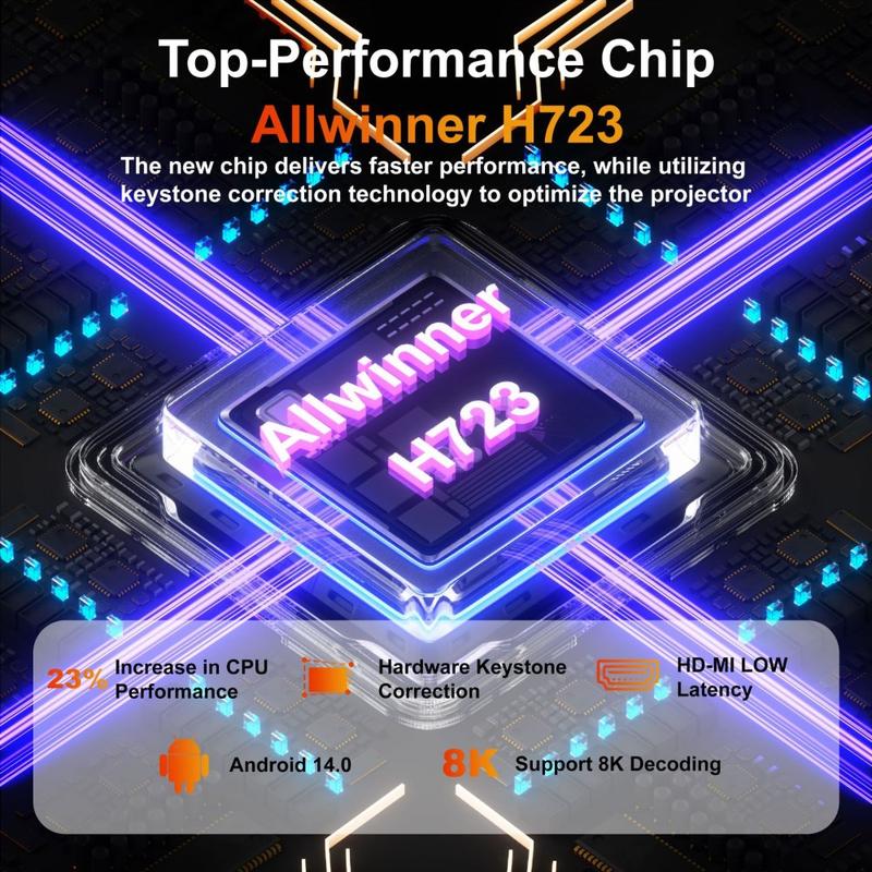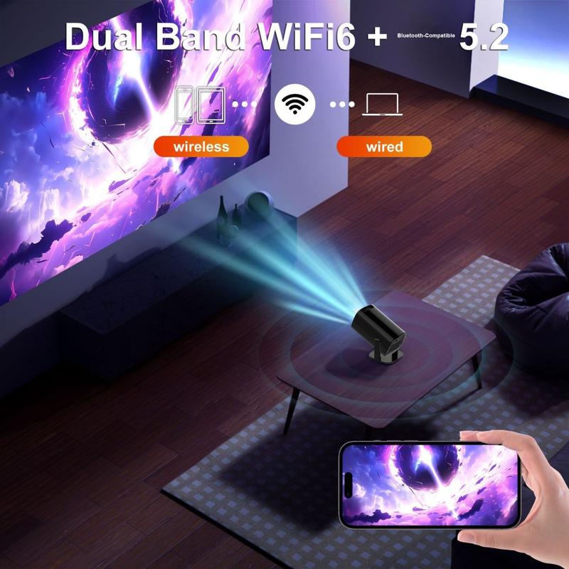 Opsætningen er hurtig og frustrationsfri takket være automatisk keystone-korrektion (30 %) og firepunktsjustering, der hjælper dig med at rette billedet, selv når projektoren ikke er perfekt centreret. Dual-band WiFi 6 og Bluetooth-kompatibel 5.2 understøtter jævne trådløse forbindelser til skærmcasting, højttalere og hovedtelefoner, og det støjsvage design (<25 dB ved 1 m) holder fokus på det, du ser.