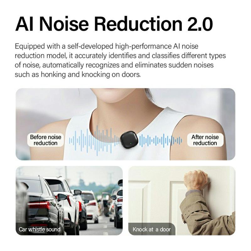V36 Mini Wireless Lavalier Microphone bruger avanceret AI-drevet støjreduktion med tre tilstande: High-Fidelity (grønt lys), AI Noise Reduction (standard, gult lys) og DSP Noise Reduction. Det sikrer, at dine optagelser er fri for uønskede baggrundslyde, mens din stemme forbliver naturlig og klar - perfekt til vlogs, interviews, livestreams og podcasts.