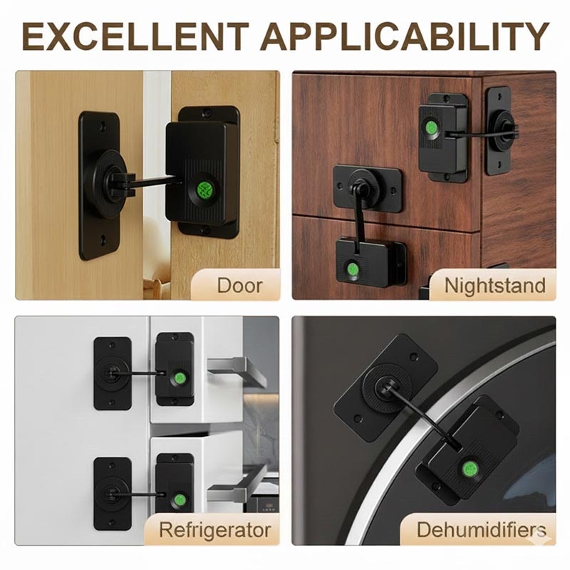 V86 børnesikring med fingeraftryk er designet til alsidig beskyttelse på alle overflader i hjemmet, herunder køleskabe, skuffer, natborde, skabe, vinduer, vaskemaskiner og arkivskabe. Med mulighed for både klæbemontage (ingen boring) og skruemontering kan den nemt tilpasses forskellige opsætninger.