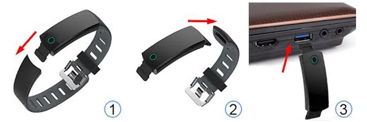 Du behøver ikke ekstra kabler, for at oplade din C20 aktivitetsmåler. Du skal blot tage remmen af, så USB porten er synlig. Tilslut den til en powerbank, en oplader, computer, laptop eller en anden USB opladerport.