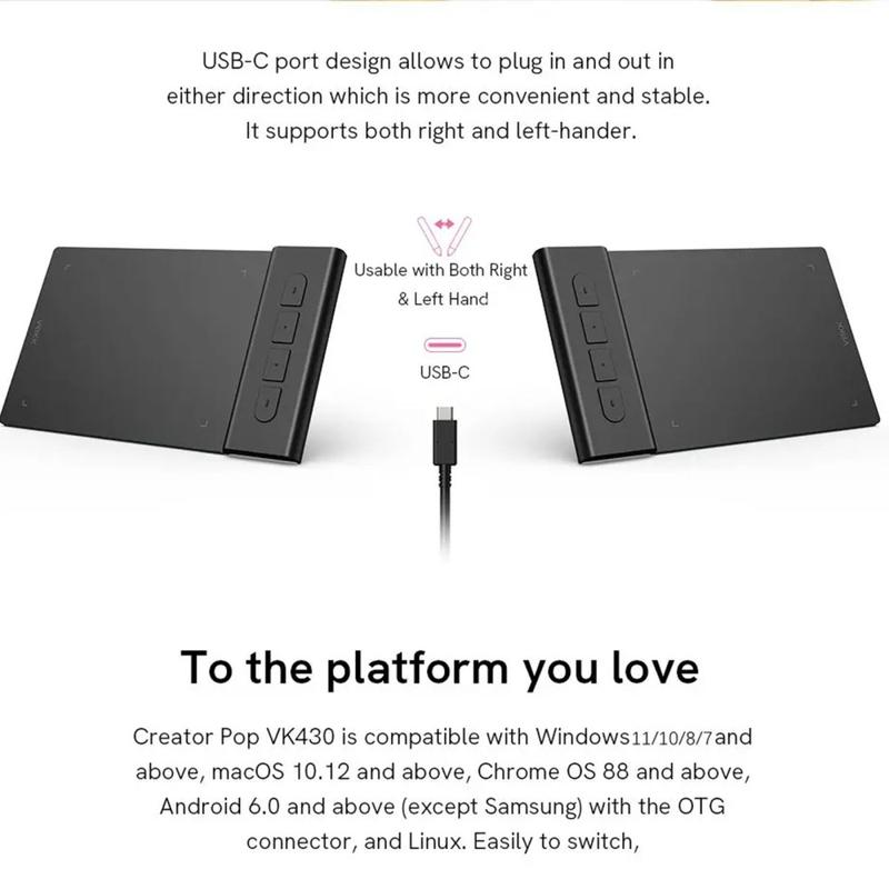 Creator Pop VK430 er ergonomisk designet til effektivitet og er udstyret med fire genvejstaster, der kan tilpasses, så du nemt kan skifte mellem forskellige programmer eller foretrukne genveje, f.eks. fortryd eller zoom ind/ud. USB-C-portdesignet muliggør plug-and-play i enhver retning, hvilket sikrer bekvemmelighed og stabilitet, samtidig med at det understøtter både højre- og venstrehåndede brugere.