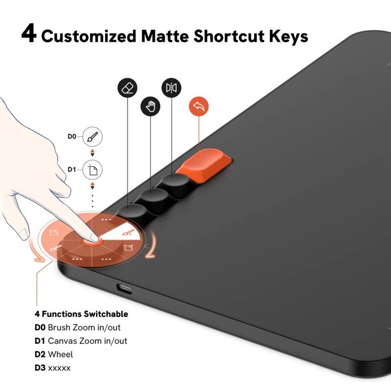 Denne tegnetavle har en justerbar drejeknap, der giver dig mulighed for hurtigt at justere penselstørrelse, hårdhed, flow, opacitet samt udføre handlinger som at zoome ind, zoome ud og trække billedet rundt.