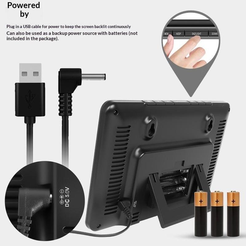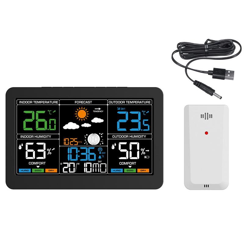 Vejrstationen kan strømforsynes via USB til kontinuerlig skærmvisning og baggrundsbelysning, mens batteribackup hjælper med at holde den funktionsdygtig under strømafbrydelser. Denne dobbelte strømforsyning øger pålideligheden og fleksibiliteten, især for brugere, der ønsker en stabil skærm med ekstra backup-understøttelse.