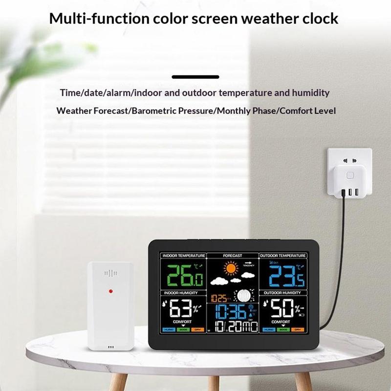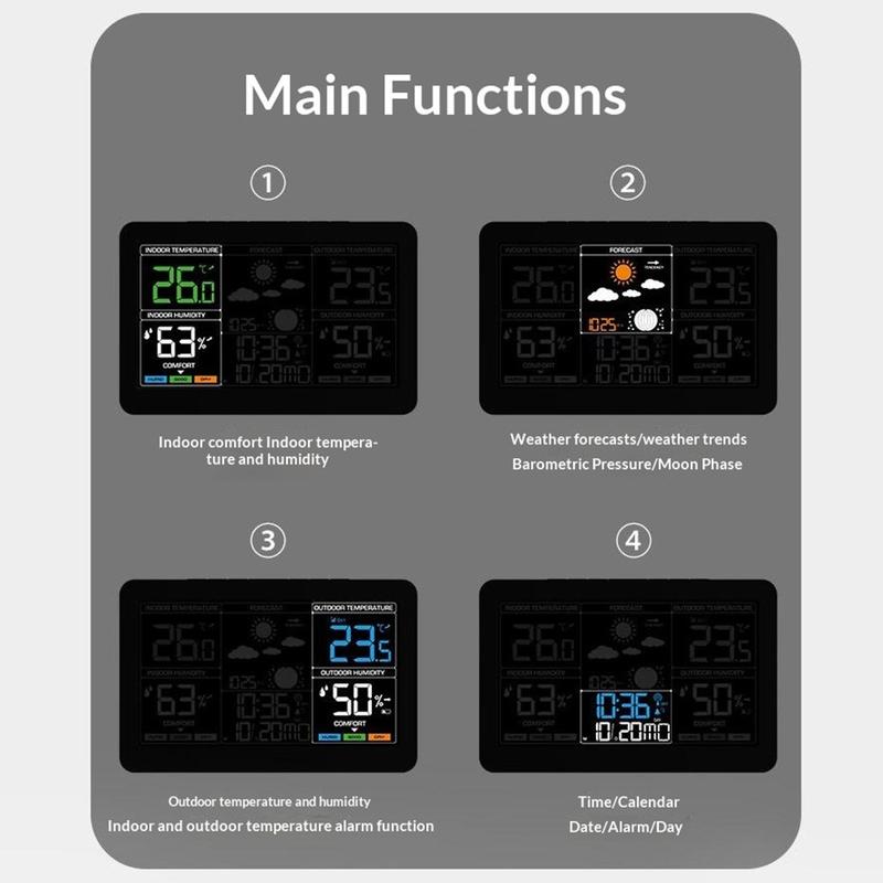Denne trådløse vejrstation samler tid, dato, alarm, indendørs og udendørs temperatur, fugtighedsmåling, vejrudsigt, lufttryk, månefase og komfortindikator i én praktisk enhed. Med sin store farveskærm og overskuelige layout er den et nyttigt supplement til soveværelset, køkkenet, kontoret eller stuen. Den hjælper dig med at få et hurtigt overblik over vigtige daglige oplysninger, samtidig med at den bidrager til et mere organiseret rum.