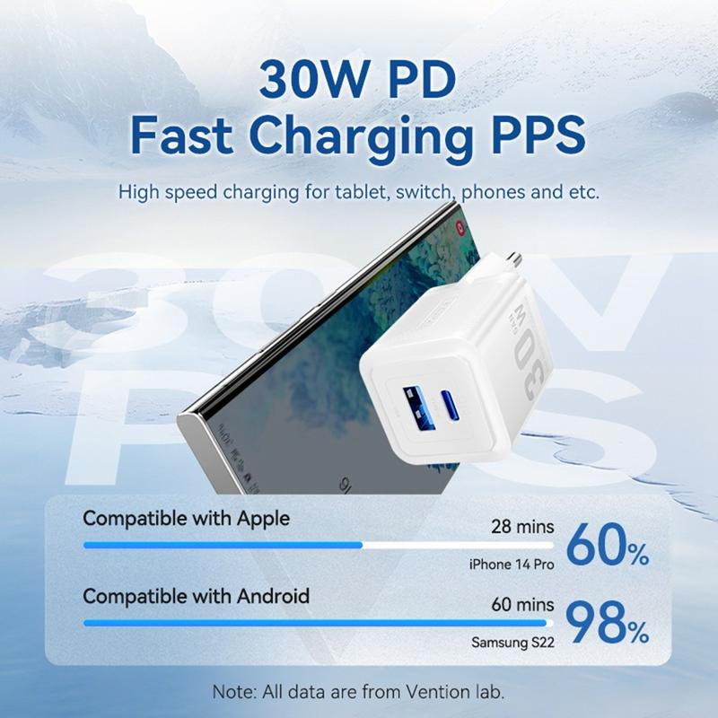 Oplad telefoner, tablets og øretelefoner i topfart med et stik i lommeformat. VENTION FEQ GaN-opladeren bruger næste generations galliumnitridkomponenter til at levere hele 30 W gennem enten USB-C- eller USB-A-porten, samtidig med at den er køligere og mindre end gammeldags siliciumklodser. Understøttelse af flere protokoller betyder hurtig og sikker strøm til alt fra iPhone- og Galaxy-telefoner til Nintendo Switch og Bluetooth-højttalere, både hjemme og på farten.