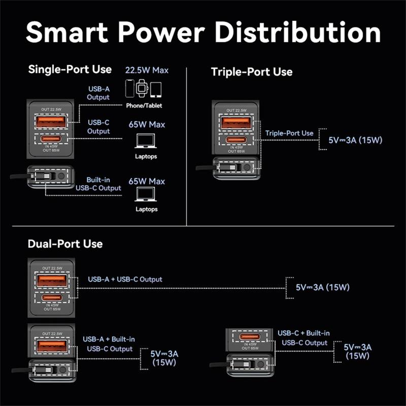 - Maks. udgange: USB-C 65W; USB-A 22,5 W; indbygget kabel 65W.