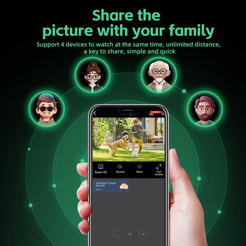 Den indbyggede mikrofon understøtter lydoptagelse og tovejskommunikation, mens understøttelse af både TF-kortlagring og cloud-lagring giver dig større fleksibilitet, når du gemmer optagelser. Infrarød sort-hvid nattesyn hjælper også med at opretholde synligheden under mørkere forhold, så du kan fortsætte overvågningen, selv når lyset er slukket.