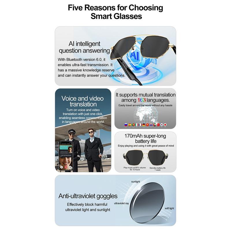 Oplev næste generations håndfri kommunikation. W100C-smartbrillerne kombinerer live stemmeoversættelse på 163 sprog, Bluetooth-lyd med åbne ører og AI-stemmeassistance i et letvægtsstel på 25 g, der passer til dagligdagen, rejser og sport.