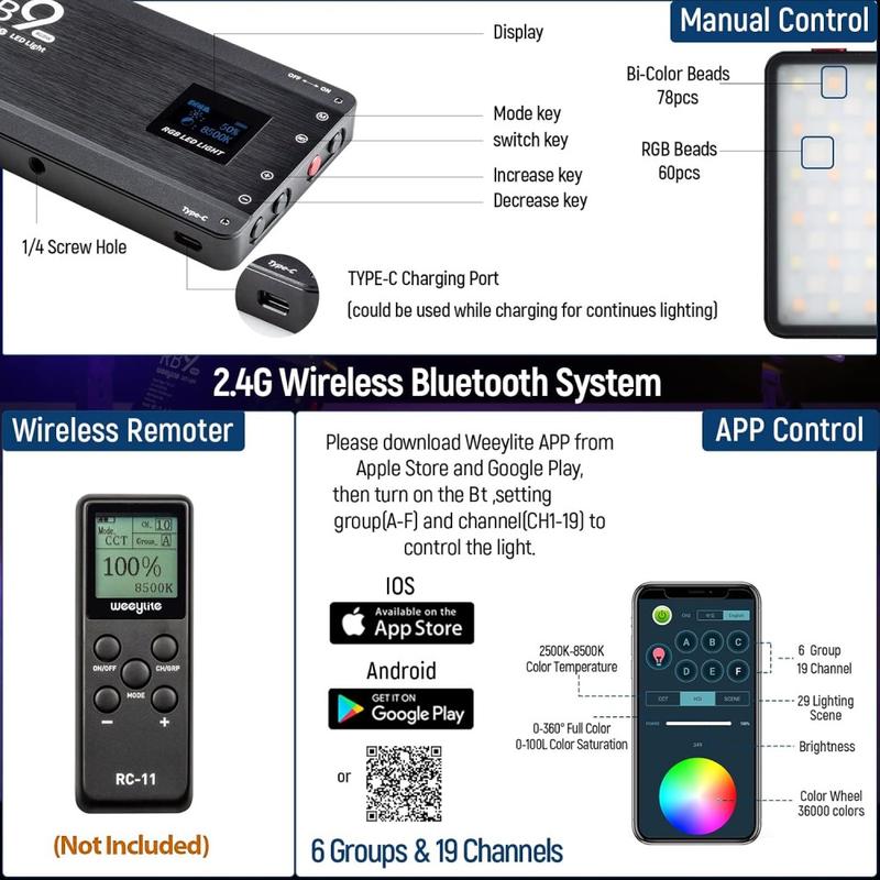 - Weeylite-appen (Android/iOS) styrer 19 kanaler og 6 grupper; drejeknapper på kroppen til hurtige justeringer