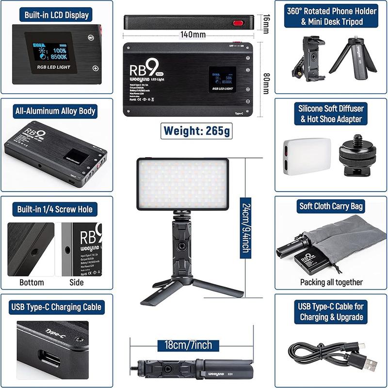 Opgrader alle optagelser fra TikTok-klip til studieinterviews. Weeylite RB9 har 12 W fuldspektret effekt, professionel farvenøjagtighed og app-fjernbetjening i et 265 g tungt panel, der nemt kan pakkes ned i en kamerataske.