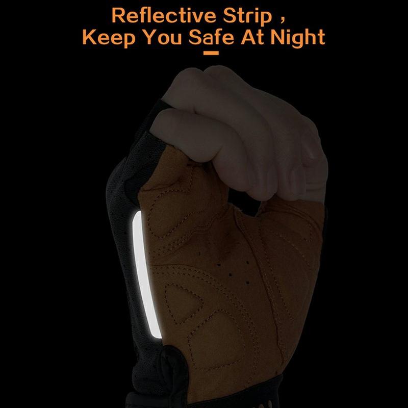 Handskerne er designet med tanke på rytterens velvære og sikkerhed og har svedtransporterende frotté til hurtig aftørring af ansigt eller pande samt reflekterende elementer, der øger synligheden under natteture. Det ergonomiske halvfinger-design forbedrer kontrol, greb og ventilation og er ideelt til langdistancecykling, MTB, landevejscykling og pendling.