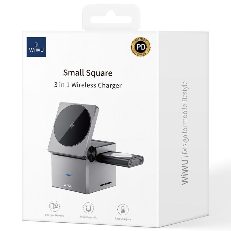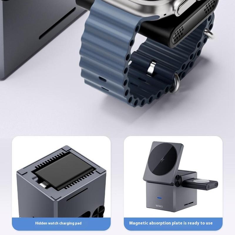 WIWU Wi-W030 er et alsidigt 3-i-1 trådløst opladningsstativ, der er designet til at forsyne din iPhone, Apple Watch og AirPods med strøm samtidig. Med sit foldbare design og stærke magnetiske tiltrækningskraft er den både praktisk og effektiv, hvilket gør den til et vigtigt tilbehør for dem, der har flere Apple-enheder.