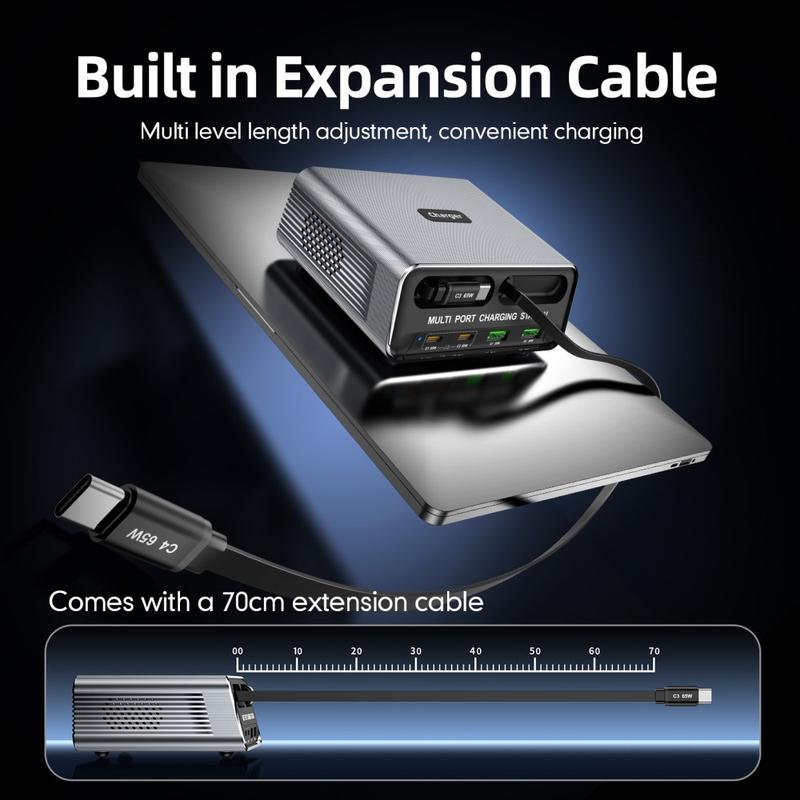 Ryd op på dit skrivebord og oplad alt fra én kompakt hub. WLX-60C GaN-desktop-opladningsstationen kombinerer 6 udgange i én integreret enhed: 2 USB-C-porte, 2 USB-A-porte og 2 indbyggede udtrækkelige USB-C-kabler. Træk blot i det 70 cm lange kabel, når du har brug for det, og lad det trække sig tilbage med magnetisk opbevaring, når du er færdig, så du undgår kabelrod på kontorbordet, gaming-setups og hjemmearbejdspladser.