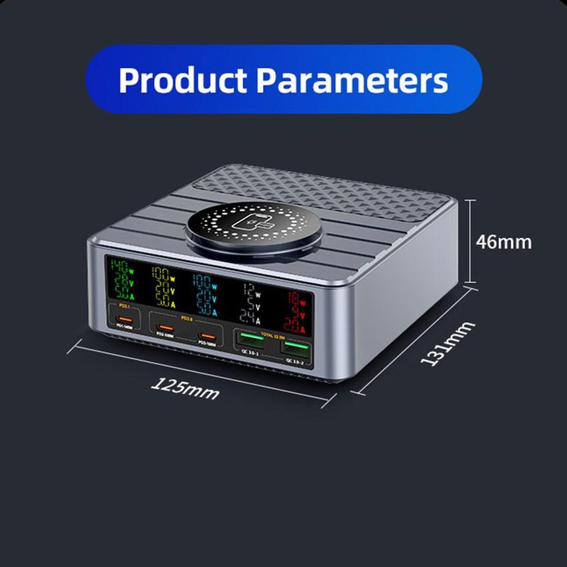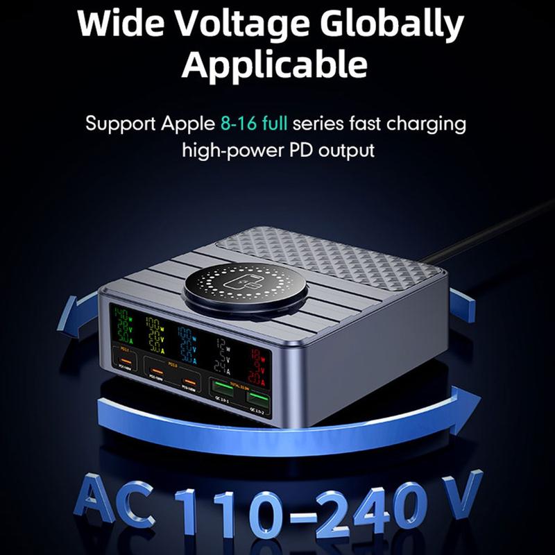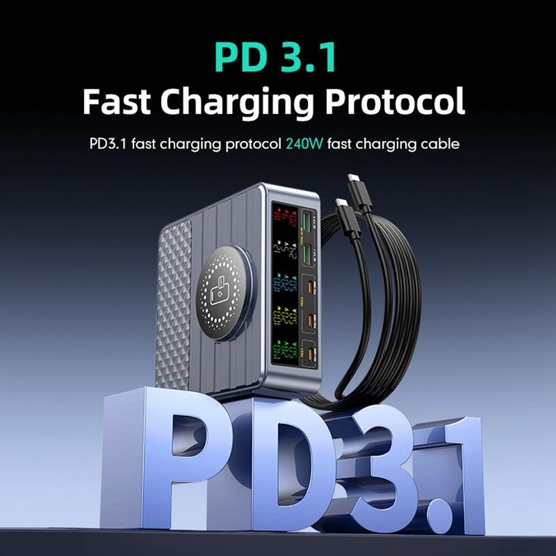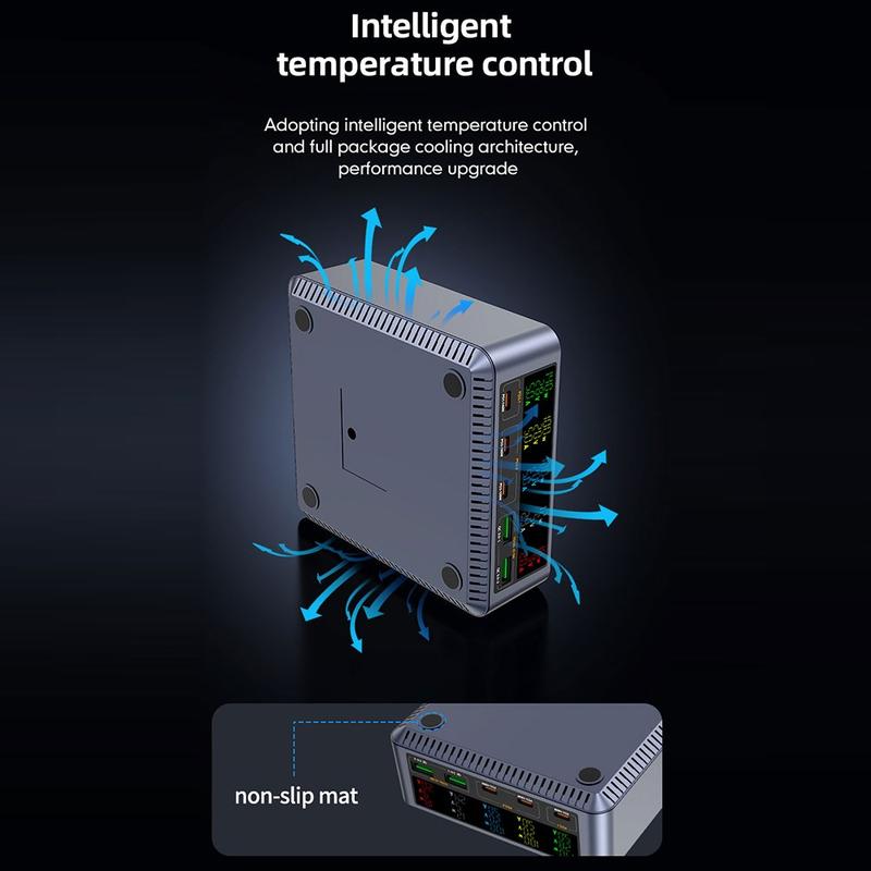 Det indbyggede digitale display giver indsigt i opladningseffekt og portstatus i realtid, hvilket gør det nemt at overvåge strømfordelingen. Med 9-lags sikkerhedsbeskyttelse sørger opladeren for sikker og stabil drift af al tilsluttet elektronik.