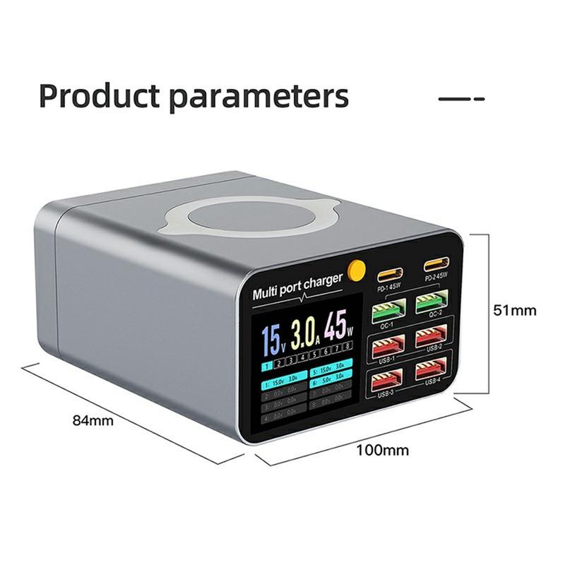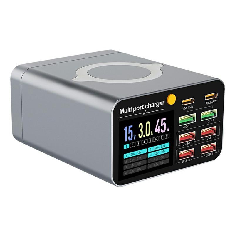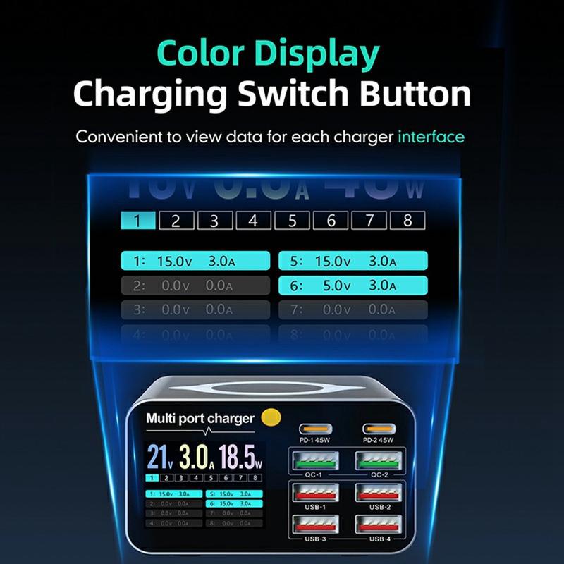 - 8-port-design: 2 × USB-C PD, 2 × QC, 4 × USB