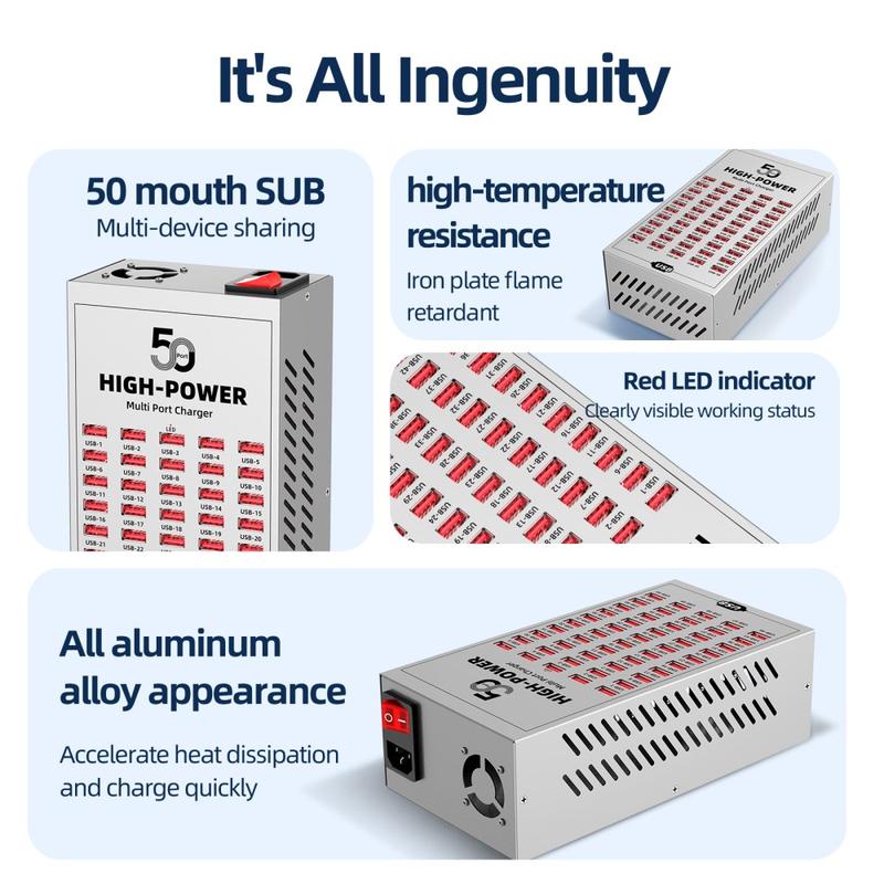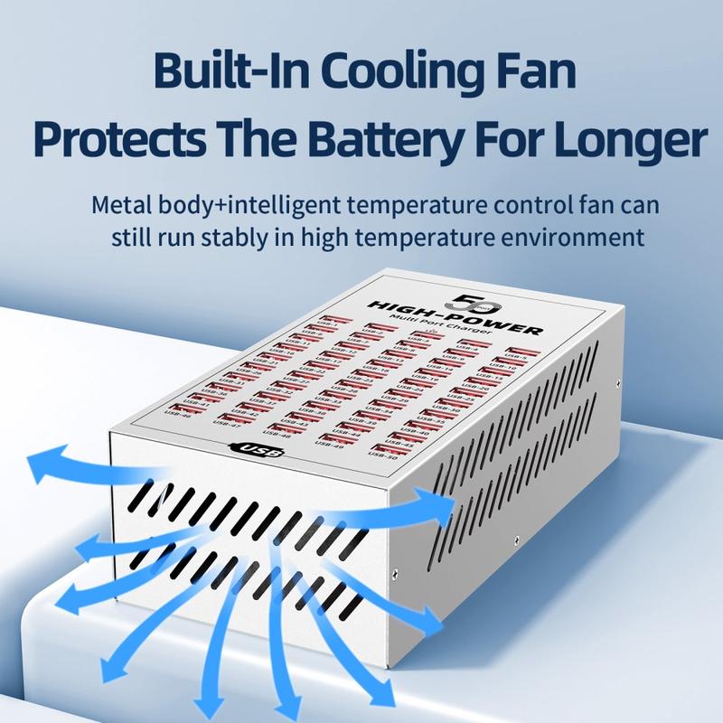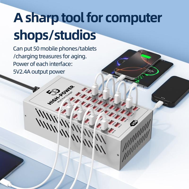 - 50 USB-porte til samtidig opladning af flere enheder i kommercielle og industrielle miljøer