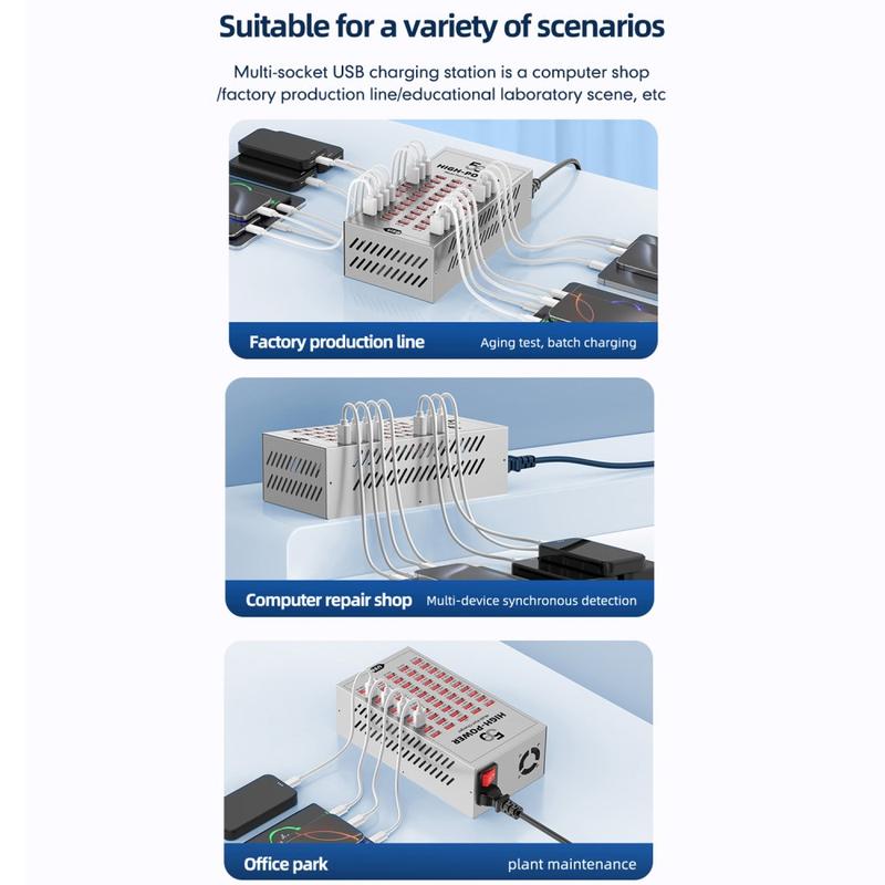 - Arbejdsstationer og værksteder: oplad kundernes telefoner og test enheder i batches