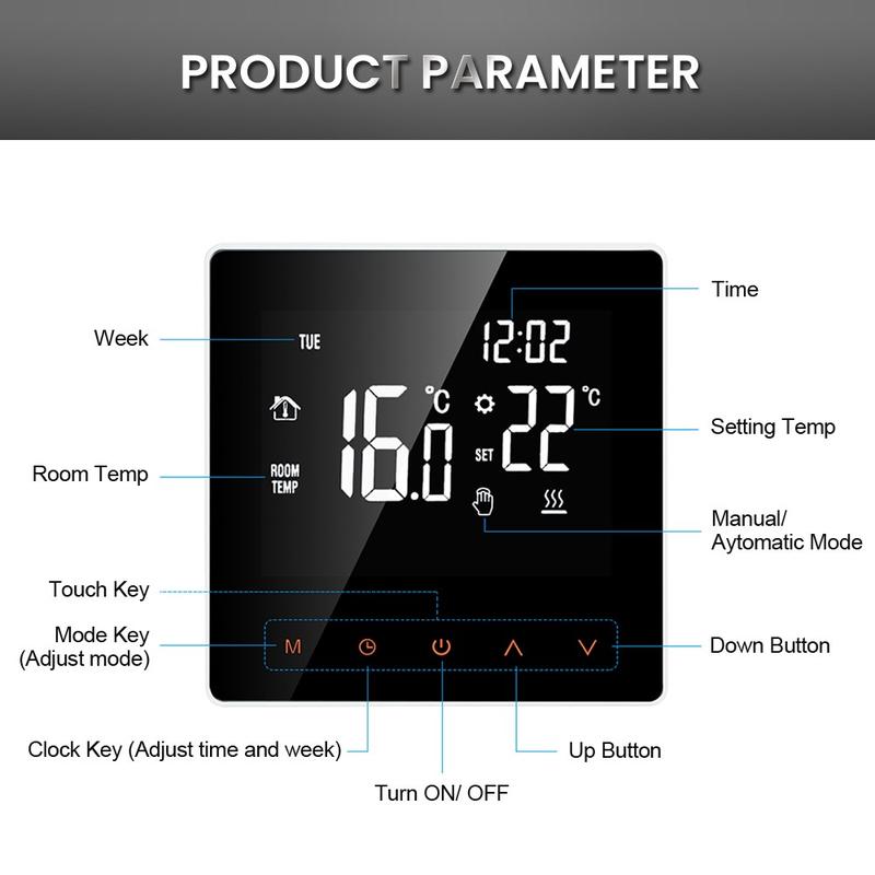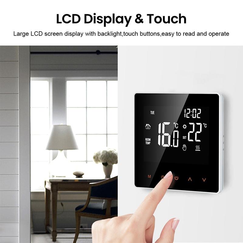 Den store LCD-berøringsskærm med baggrundsbelysning er let at aflæse både dag og nat. Det elegante design i ét stykke giver termostaten et pænt og moderne look, mens den ridsefaste overflade hjælper med at holde den præsentabel over tid. Du kan vælge mellem manuel tilstand til direkte justering og automatisk tilstand til programmeret opvarmning, afhængigt af din daglige rutine og personlige præferencer.