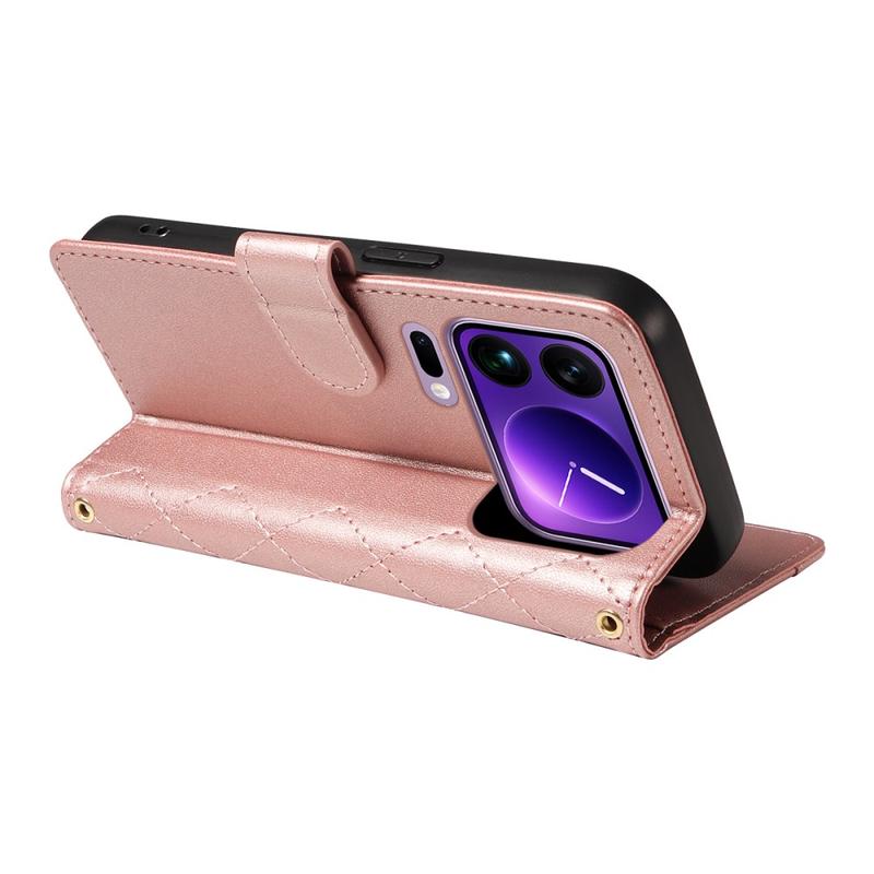 Beskyt din Xiaomi 17 Pro Max med denne luksuriøse, quiltede pung. Den er fremstillet af TPU-materiale belagt med PU-læder, hvilket gør den ridsefast og fingeraftryksbestandig, så din telefon ser stilfuld og elegant ud. Syningen danner et rombeformet gittermønster, der giver coveret et moderne og smukt touch. Den hævede kant på kameraet og skærmen giver effektiv beskyttelse mod ridser, mens de præcise udskæringer giver fuld adgang til alle knapper, porte og andre funktioner. Pungdesignet giver mulighed for nem opbevaring af vigtige kort og kontanter. Med ekstra beskyttelse mod ridser, stød, fald og daglige skader leveres dette cover også med en skulderrem og en håndledsrem for ekstra bekvemmelighed.