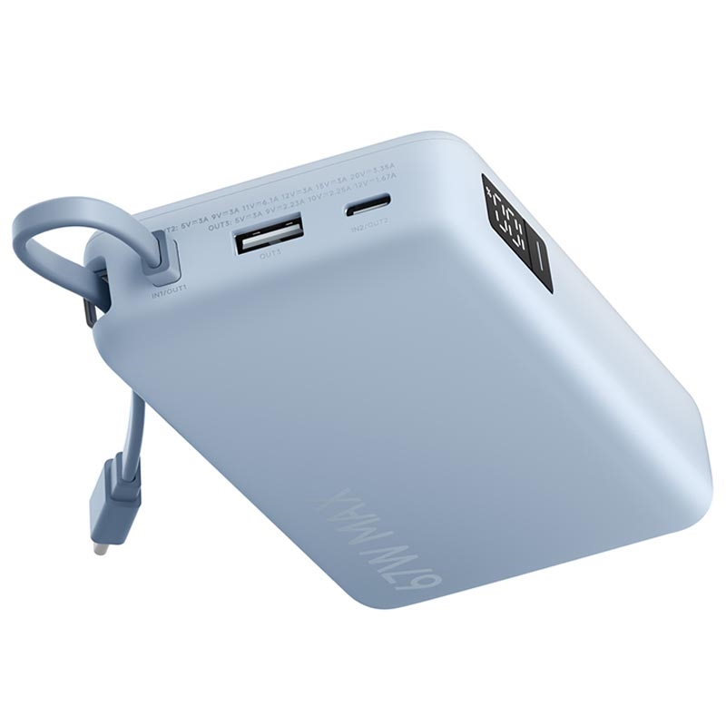 Denne powerbank er ideel, hvis du ønsker hurtig opladning med et rejsevenligt design. 67W-udgangen dækker mere end bare telefoner, 65 W-genopladningen reducerer nedetiden, og det integrerede USB-C-kabel gør det nemmere at pakke og bruge hvor som helst. Tilføj det klare digitale display og opladning med flere porte, og du får en pålidelig strømløsning til arbejde, rejser og daglig brug.