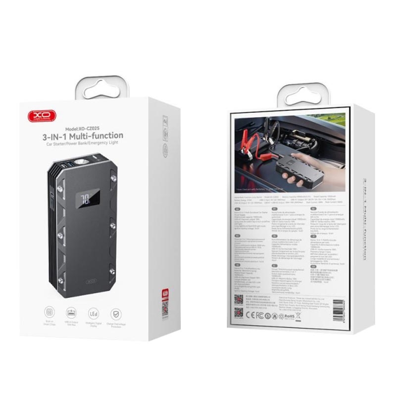 XO CZ025 3-i-1 starthjælp til bil og powerbank 10000 mAh (37 Wh) - 500 A startstrøm, USB-C, LED-lommelygte