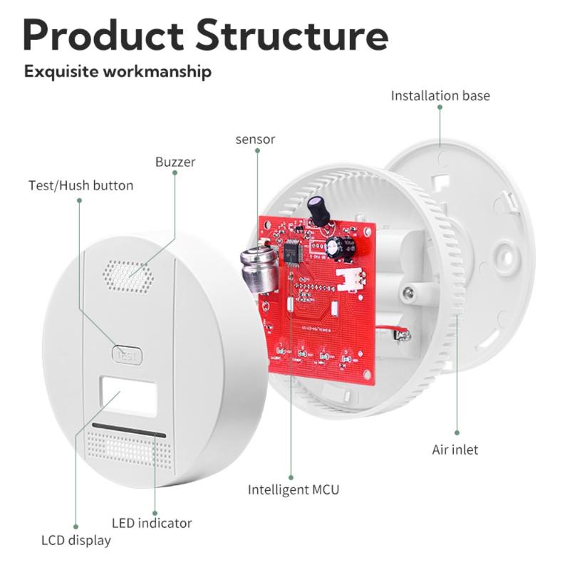 Høj alarm med visuel indikator: I tilfælde af kuliltedetektion giver alarmen både hørbar og visuel advarsel. Den høje lyd og de blinkende lys giver dig hurtigt besked om farlige CO-niveauer, så du har tid til at træffe passende foranstaltninger.