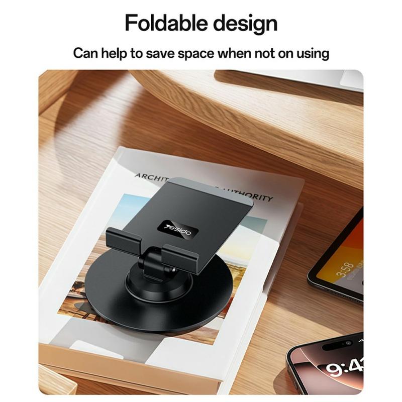 YESIDO C300 er et førsteklasses skrivebordsstativ designet til smartphones og små tablets, der kombinerer holdbarhed med elegant stil. Den er fremstillet med en base af oxideret jern og en dreje- og klemmefunktion af aluminiumslegering, som giver stabilitet og lang levetid. Med 3 drejepunkter og en 360° roterende base giver dette stativ mulighed for fleksible justeringer til videoopkald, streaming, læsning eller browsing. Den silikonepolstrede klemme beskytter enhederne mod ridser og sikrer samtidig et fast greb, hvilket gør den til en ideel håndfri løsning til hjemmet, kontoret eller studiet.