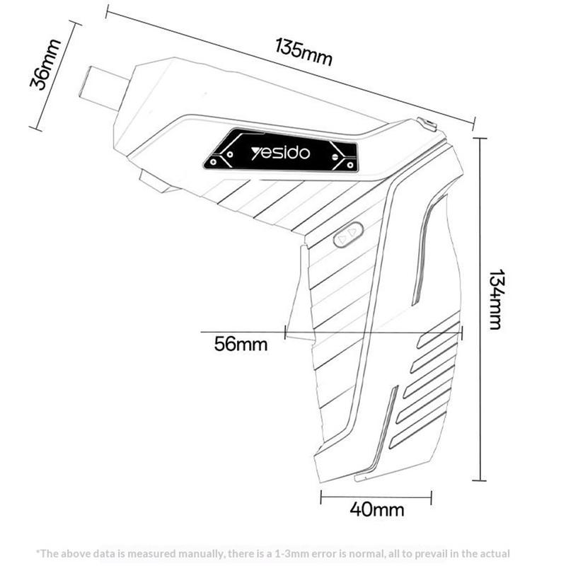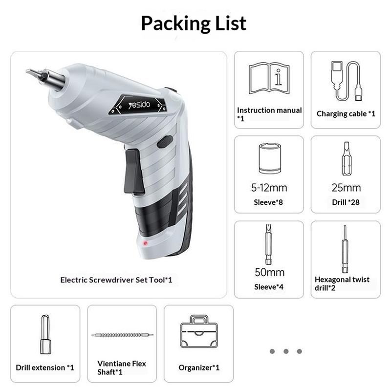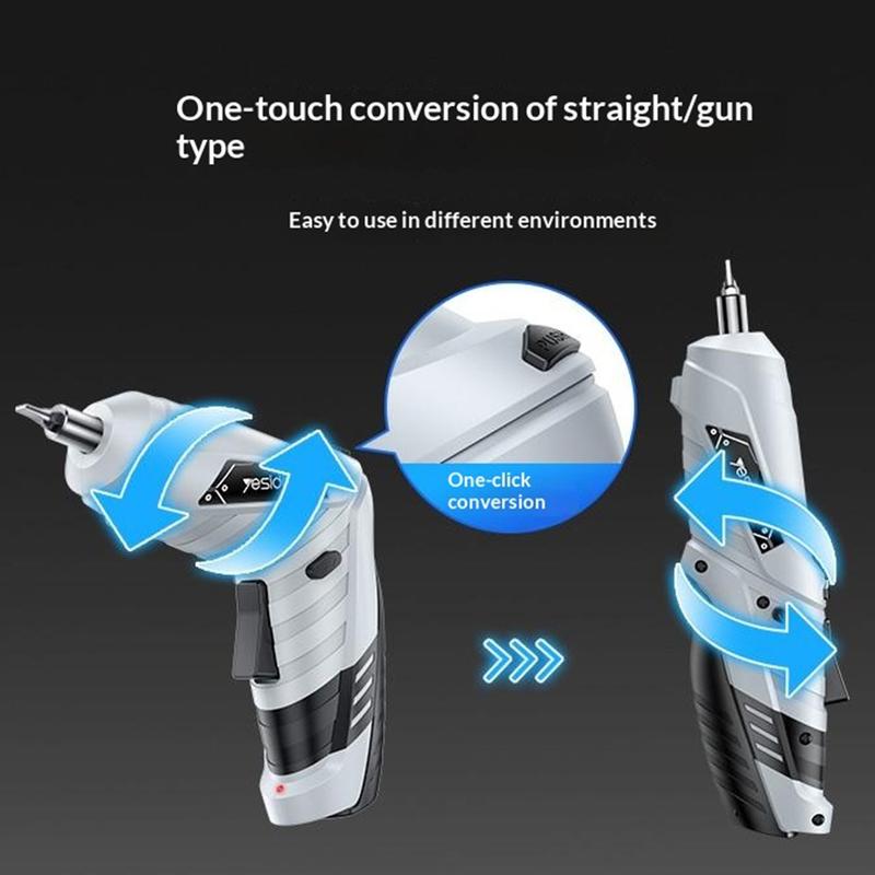 Gør de daglige reparationer nemmere med YESIDO EC34-sæt med elektrisk skruetrækker. Dette batteridrevne værktøj er designet til brug i hjemmet, til gør-det-selv-projekter og generelle vedligeholdelsesopgaver og forener praktisk kraft, fleksibel anvendelse og et kompakt design i ét komplet sæt. Takket være den dobbelte funktionalitet kan du skifte mellem lige og pistolformet tilstand med et enkelt tryk, hvilket gør det nemmere at arbejde både i åbne områder og på trange steder.