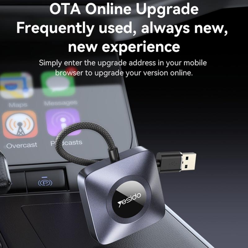 Opgrader enhver fabriksmonteret head-unit, der allerede understøtter kablet Apple CarPlay, og slip for altid for kabelrodet. YESIDO KM23 sættes i din USB-CarPlay-port og tilføjer øjeblikkeligt hurtig 5 GHz/2,4 GHz Wi-Fi 6 plus Bluetooth 5.0, så din iPhone automatisk opretter forbindelse, når du starter motoren. Nyd jævnere navigation, opkald uden forsinkelse og skarpe 1080 p app-visuals - og hold det hele opdateret med one-tap over-the-air firmwareopdateringer.