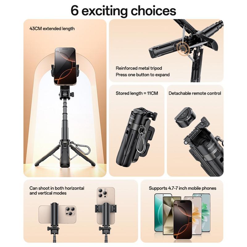 Fang hver eneste rejse uden stort udstyr. YESIDO SF29 kan foldes ned til kun 10 cm, så den er nem at have med i lommen, og kan derefter foldes ud til 43 cm og blive til et stabilt stativ med fire ben. En aftagelig Bluetooth-fjernbetjening og en 360 graders roterende klemme giver dig mulighed for at skifte problemfrit mellem portrætvlogs, landskabsgruppebilleder og håndfri livestreams. Uanset om du vandrer ad bjergstier eller præsenterer produkter på et skrivebord, holder denne lette hjælper din telefon stabil, og din kreativitet flyder.