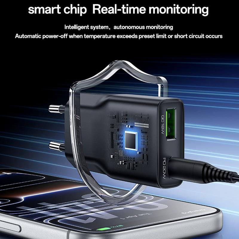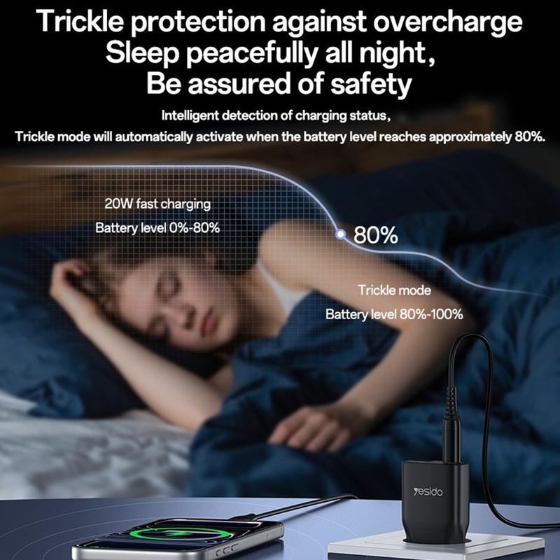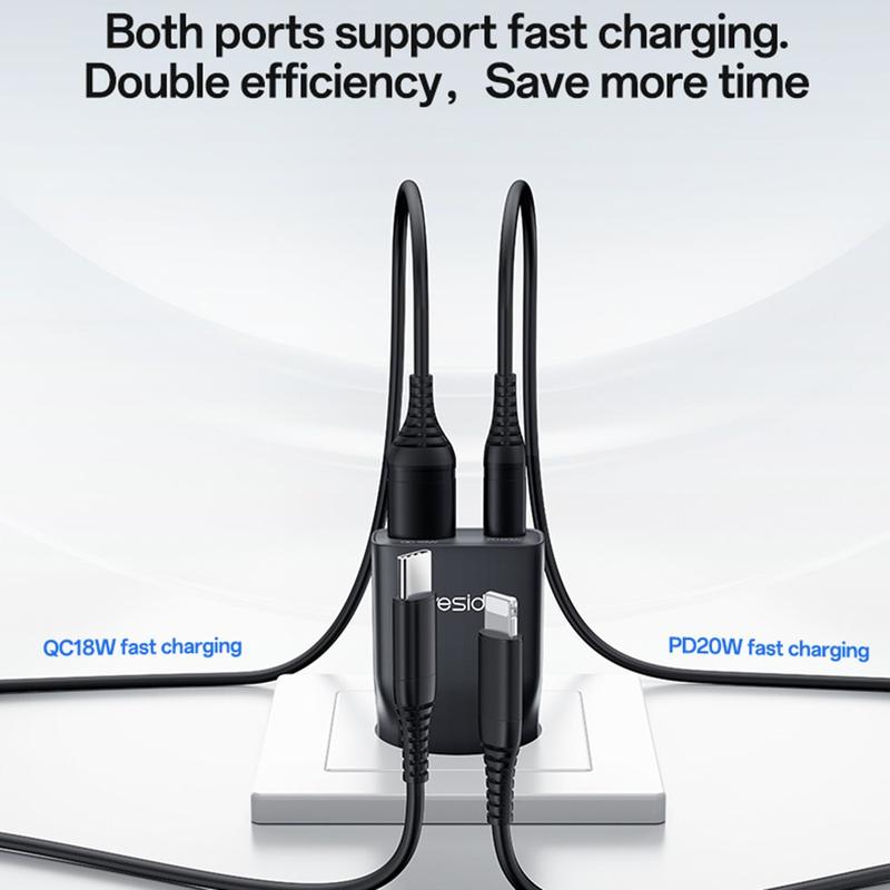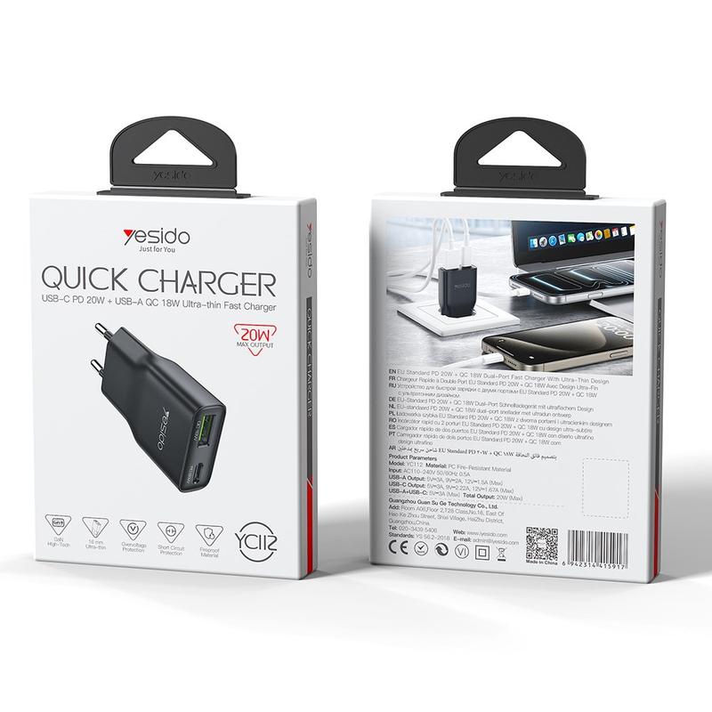 USB-C-porten understøtter hurtigopladning på op til 20W, hvilket gør den ideel til smartphones, mindre tablets, øretelefoner og andre kompatible enheder. USB-A-porten understøtter også hurtigopladning på op til 18 W, og når begge porte bruges samtidigt, leverer opladeren en stabil delt udgang til to enheder. YC112 er udviklet med understøttelse af PD- og QC-hurtigopladningsprotokoller og hjælper med at levere effektiv og sikker opladning, samtidig med at unødvendig varme og energitab reduceres.