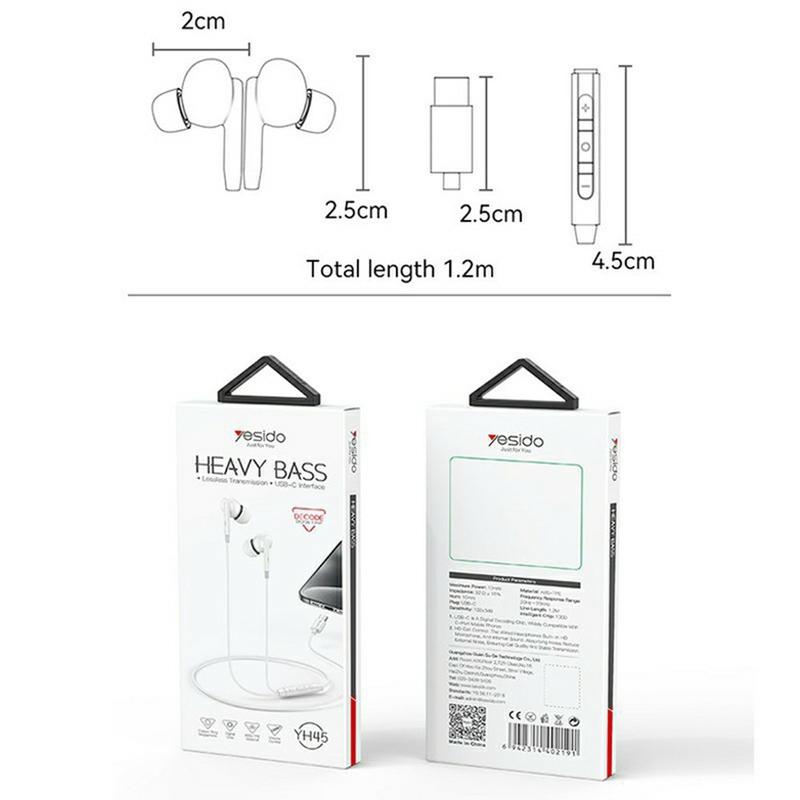 Yesido YH45 USB-C-øretelefoner med DAC-chip - In-ear-øretelefoner med mikrofon og betjeningsknapper, 10 mm driver