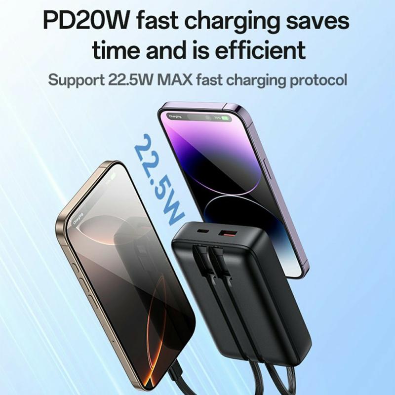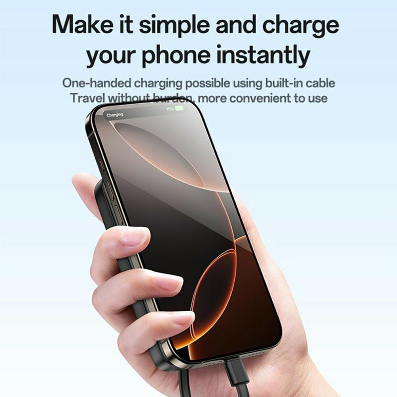 - Indbyggede kabler: Integrerede Type-C- og Lightning-kabler (Lightning-kompatible) sikrer, at du altid er klar til at oplade uden ekstra tilbehør.