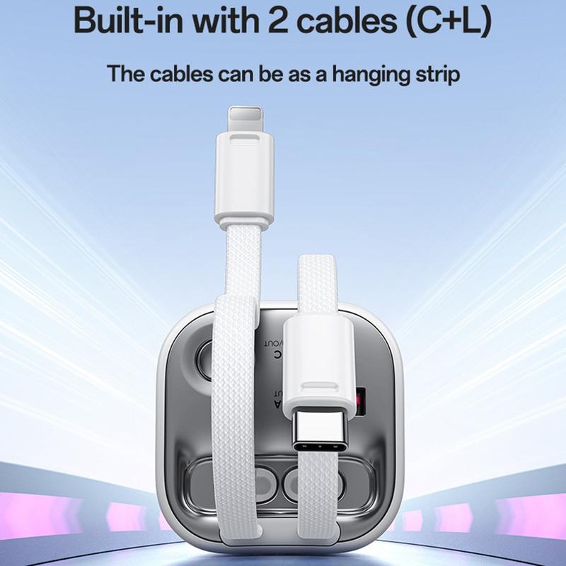 - Indbyggede USB-C- og 8-pin-kabler - oplad telefoner, tablets eller øretelefoner uden at slæbe rundt på ekstra ledninger.