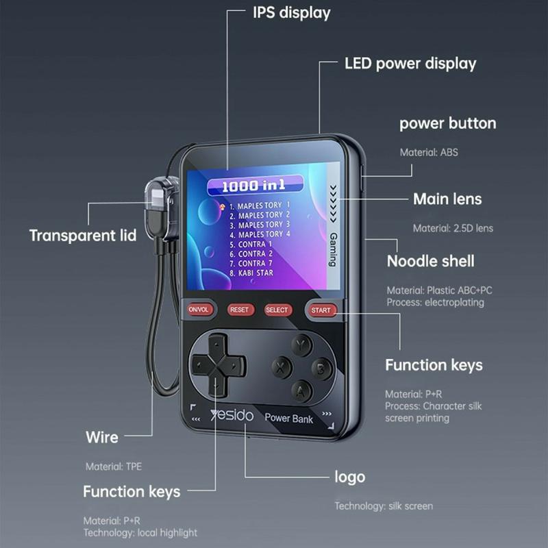 YESIDO YP87 er en unik 2-i-1-enhed, der kombinerer en kraftfuld 10000mAh powerbank med en retro håndholdt spillekonsol. Den er designet til underholdning og hverdagsopladning og giver dig mulighed for at oplade dine enheder, mens du nyder klassiske spil på en levende 2,8" IPS-skærm. Den er kompakt og let og er en ideel ledsager til rejser, pendling og fritid på farten.