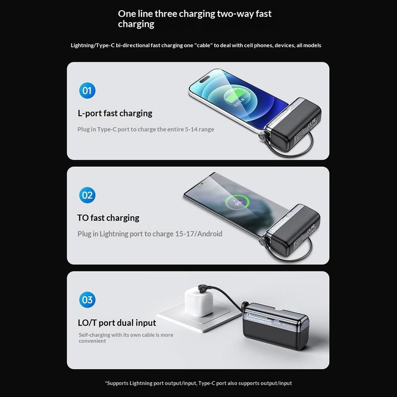 Både USB-C- og USB-L-portene understøtter tovejsopladning, hvilket gør det muligt for powerbanken selv at oplade hurtigt, samtidig med at den tilbyder fleksible opladningsmuligheder for enheder. Den kan understøtte opladning af mere end én enhed afhængigt af dine brugsbehov, hvilket gør den nyttig for folk, der har flere gadgets med sig i løbet af dagen. Denne ekstra fleksibilitet er med til at gøre den til et mere alsidigt bærbart opladningstilbehør.
