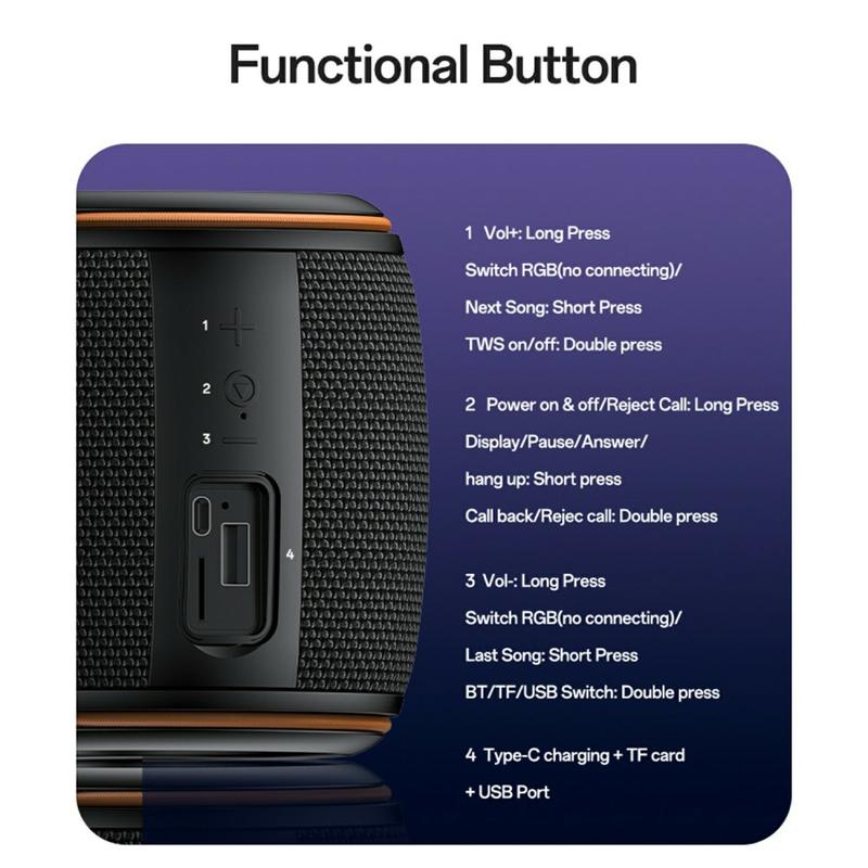 - Alsidige afspilningsmuligheder - Understøtter TF-kort, FM-radio, USB, TWS-parring, AUX-indgang og Bluetooth.