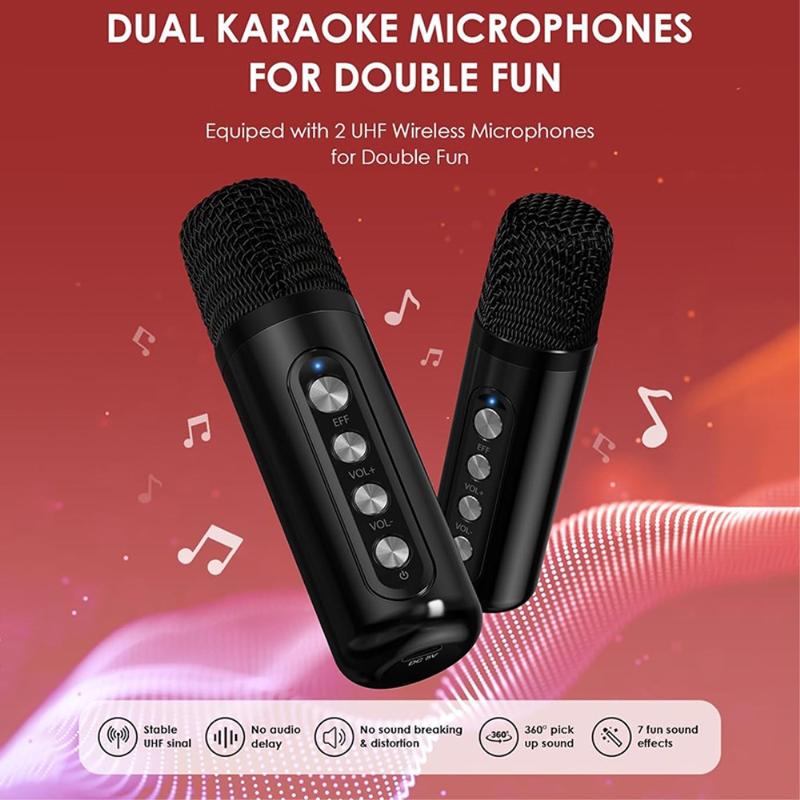 - Trådløst mikrofonpar: Leveres med to mikrofoner til duetter eller fællessang, hvilket øger det sjove ved fester.