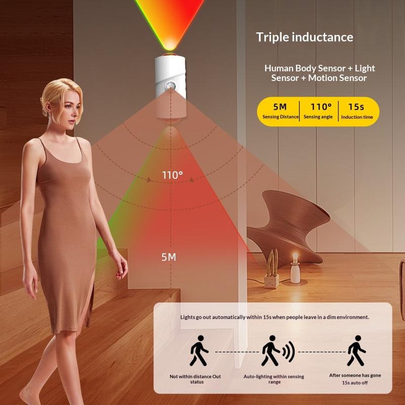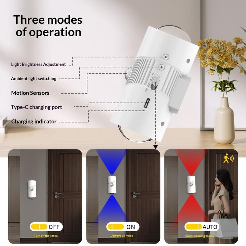 Dens smarte sensorsystem reagerer på bevægelse i svagt lys, tænder automatisk og slukker efter en kort forsinkelse for at spare energi. Med 4 lysstyrkeniveauer og flere belysningstilstande kan den bruges både som et praktisk natlys og som et hyggeligt stemningslys. Det magnetiske installationsdesign gør placeringen enkel uden boring eller kompliceret opsætning.