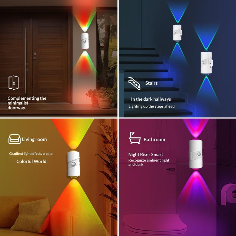 Giv dit hjem praktisk belysning og et blødt, dekorativt touch med YSJ-008A RGB smart bevægelsessensor-natlampe. Denne kompakte væglampe er designet til gange, soveværelser, skabe, badeværelser og entréer og kombinerer automatisk bevægelsesregistrering, justerbar lysstyrke og farverige RGB-lyseffekter i én praktisk, genopladelig enhed.
