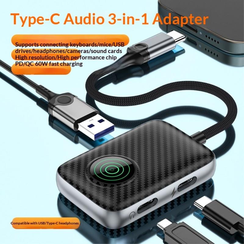 ZC4339 3-i-1 USB-C OTG-adapter/hub – USB 3.0-data, USB-C-lyd/data og 60 W PD-hurtigopladning