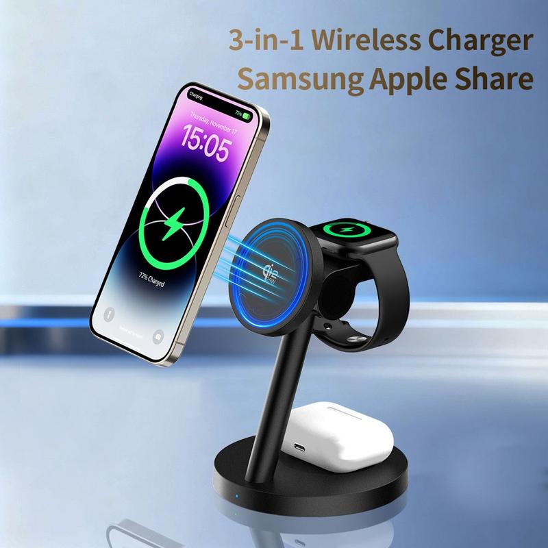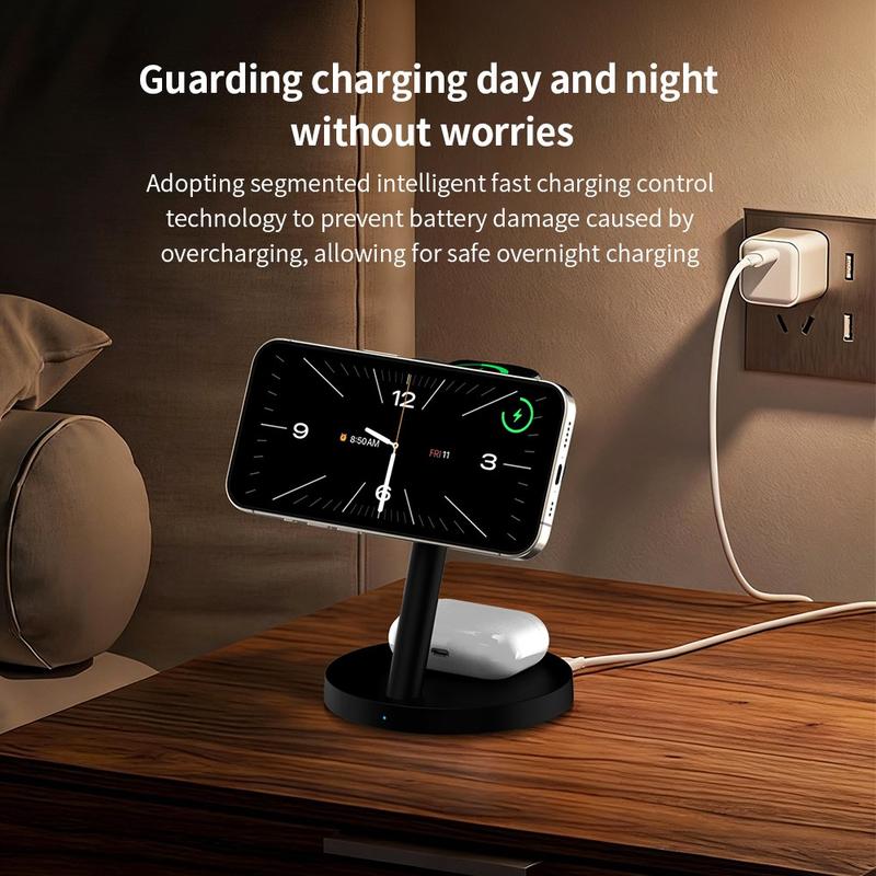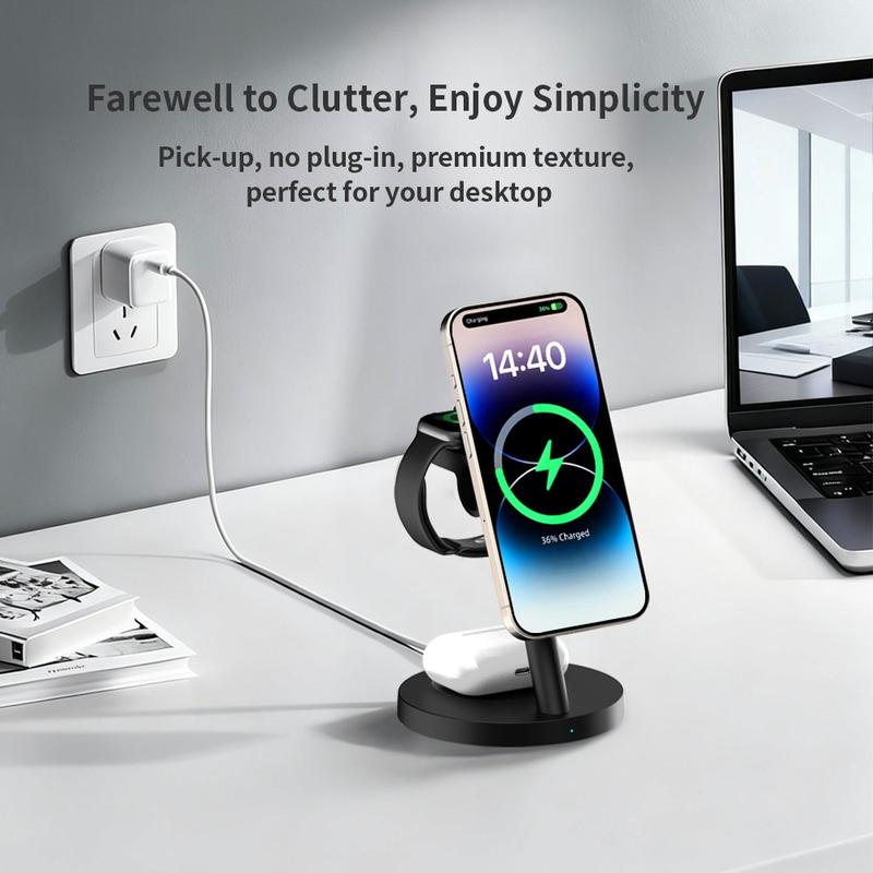 3-i-1 trådløse opladere er populære, fordi de reducerer kabelrod og gør den daglige opladning mere praktisk. Magnetiske opladningsstativer er særligt nyttige, fordi de hjælper med at placere telefonen i den rigtige position lettere end en flad opladningsplade. Modeller med justerbare holdere gør det også lettere at tjekke notifikationer, bruge standbytilstand eller holde skærmen synlig under opladning.