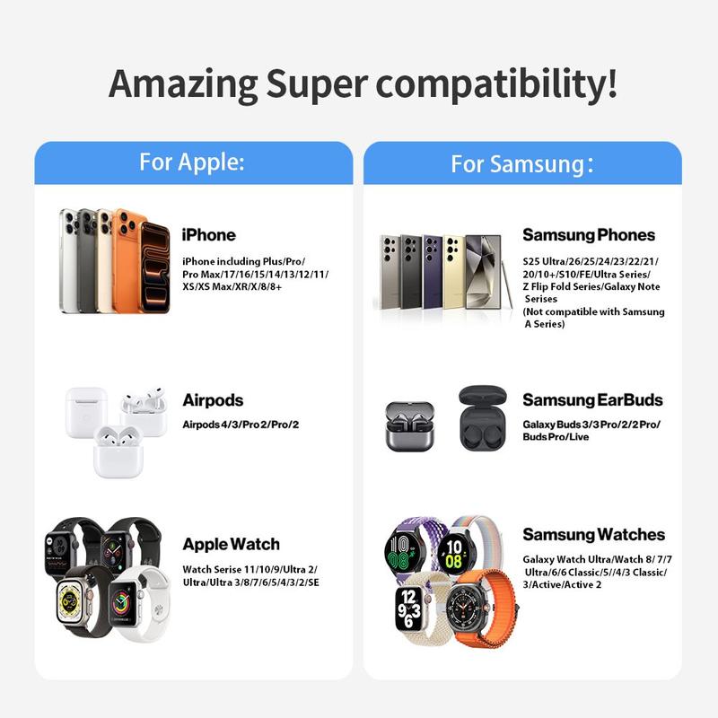 ZJ05 er en praktisk alt-i-én-ladestation, der hjælper med at holde dine daglige enheder opladet på ét overskueligt sted. Den kan oplade din telefon, dit smartwatch og dine trådløse øretelefoner på samme tid, mens den magnetiske telefonholder holder kompatible enheder på plads for at gøre opladningen nemmere. Med en effekt på op til 25W til telefoner og et justerbart design er den et smart valg til dit natbord, skrivebord eller stue.